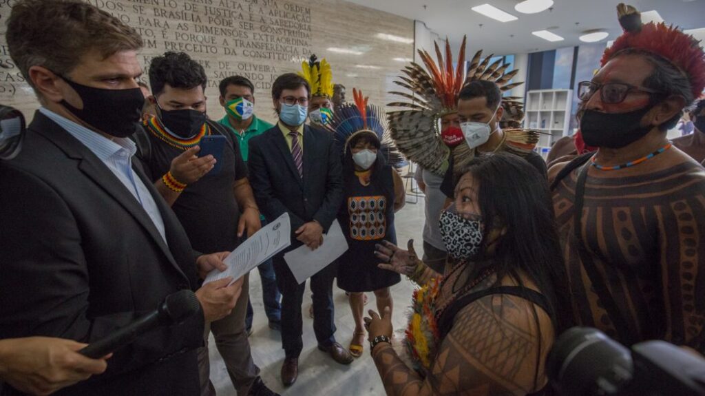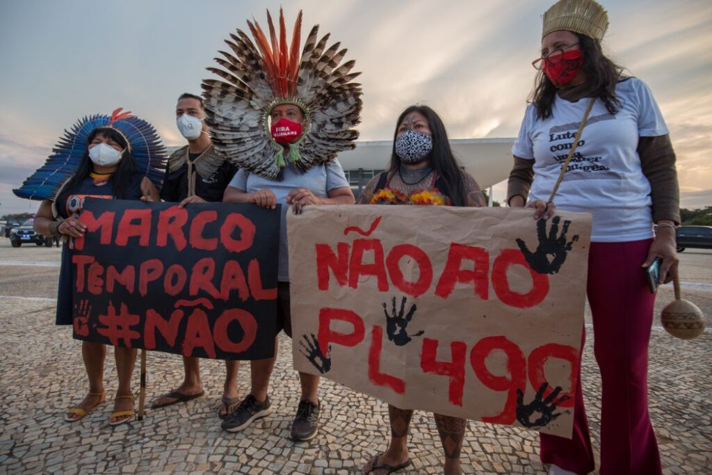 Por meio do PL 490, por exemplo, a bancada ruralista busca impor a aplicação do marco temporal como critério para as demarcações de terras indígenas, “baseada na informação falsa de que o STF já teria decidido adotar o Marco Temporal para a demarcação das todas as terras indígenas do Brasil e que o Legislativo somente estaria regulamentando a decisão do STF”, afirmam os povos no documento.