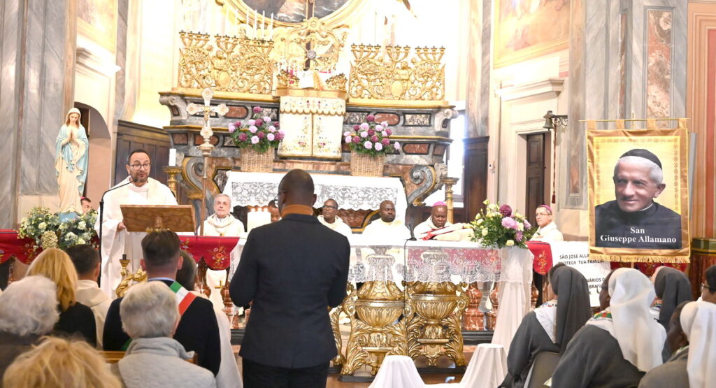 En la iglesia de San Andrés, donde el santo celebró su primera misa en 1873, a los 22 años, los preparativos van a toda marcha. En el exterior, dos paneles: el de la izquierda de la entrada representa a San José Allamano y el de la derecha a los cuatro santos de la ciudad: San José Cafasso, San Juan Bosco, Santo Domingo Savio, y el protagonista de la fiesta de hoy. El joven alcalde de Castelnuovo, Umberto Musso, dijo al final de la misa, en italiano y en inglés: «¡Tenemos un récord mundial, somos el único municipio que ha dado a luz a cuatro santos!».