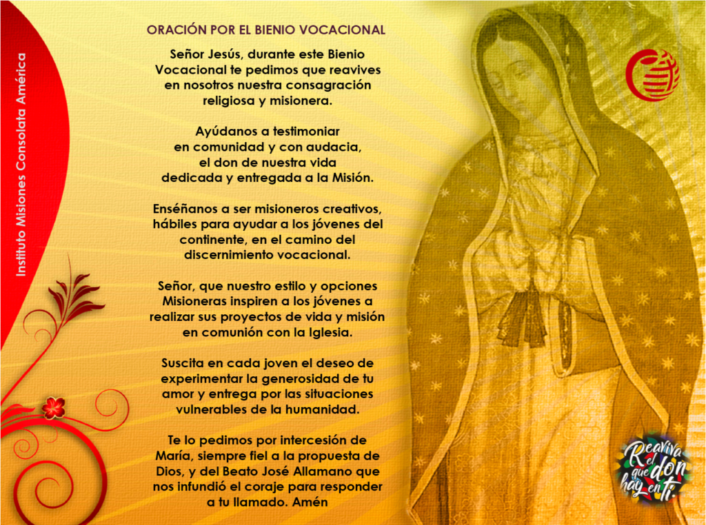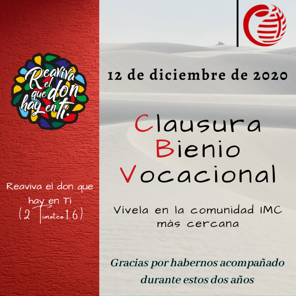 Deseamos que cada misionero viva en un constante bienio vocacional, continuemos celebrándolo desde nuestros servicios, opciones y comunidades responsablemente. Que sigamos inspirados en lo que nos recuerdan las Constituciones IMC No. 81: “Contentos de haber respondido a Cristo, que sigue llamando discípulos para el anuncio del Evangelio a las gentes, ayudamos a los demás a percibir la misma llamada y seguirla con valentía, con la oración, el testimonio de vida y la explícita propuesta vocacional. Todo misionero, en cualquier actividad, siéntase animador vocacional.”