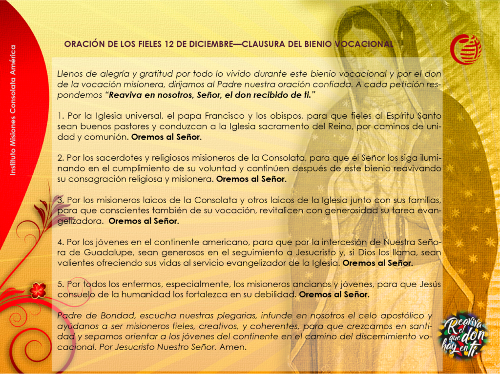 Después de haber transitado dos años (2019-2020) en los que celebramos el Bienio Vocacional Continental con alegría y agradecimiento, les recordamos que dicho bienio que inició el 16 de febrero 2019 finalizará el próximo 12 de diciembre de 2020, en la fiesta de Nuestra Señora de Guadalupe.