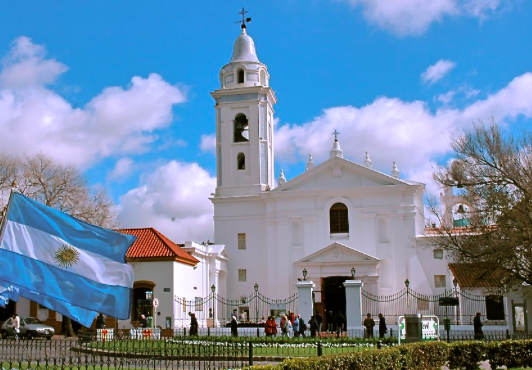 La primera misa fue celebrada en la Patagonia el 01/04/1519 por un sacerdote que acompañó a la expedición de Fernando de Magalhães, que se encontró con el pueblo Tehuelche. Los primeros colonos llegaron en 1536, encontrando docenas de culturas y naciones indígenas. Fueron acompañados por franciscanos y dominicos. Los misioneros comenzaron la labor de evangelización en 1530. La organización diocesana fue inaugurada el 01/07/1547 con la creación de la diócesis de Río de la Plata, erigida por el Papa Pablo III. Las reducciones jesuíticas fueron un sello religioso en el continente. Los jesuitas serán expulsados del país en 1767. La independencia argentina del domininio de España tuvo lugar el 22 de mayo de 1810 y se completó con la Declaracion oficial el 9 de julio de 1816.