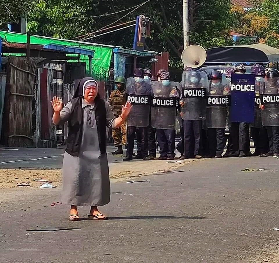 En medio de la violencia, llamó la atención el gesto de una religiosa en las calles de la ciudad de Myitkyina, capital del estado de Kachin, en el norte de Myanmar. La hermana Ann Nu Thawng, de la Congregación de San Francisco Javier, rogó de rodillas a las fuerzas de seguridad que no dispararan a los jóvenes manifestantes que protestaban pacíficamente.