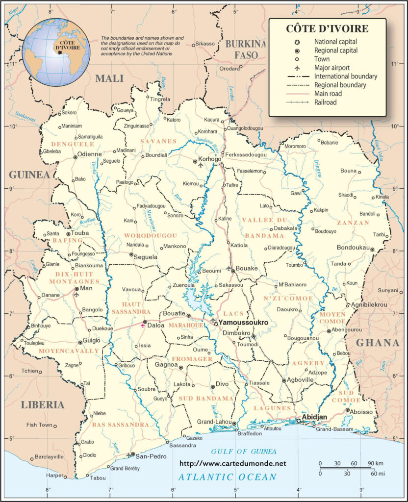 Costa de Marfil tiene una superficie de 322.461 kilómetros cuadrados y limita con Burkina, Ghana, Guinea, Liberia y Mali. Las lenguas que se hablan en el país son el francés, el dioula y el baoulé. Su capital política es Yamousoukro, con 260.000 habitantes, y la económica es Abiyán, con 3,6 millones de habitantes. La tasa de fertilidad del país es de 3,67 hijos por mujer, la esperanza de vida es de 50,4 años y la población urbana es del 46%.