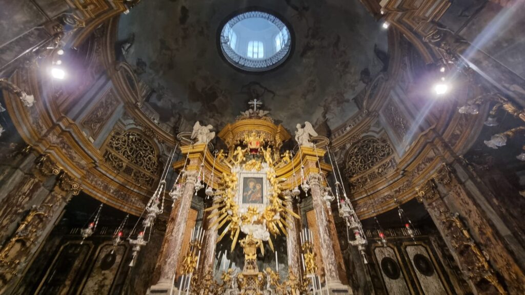 Con María y el Niño en su regazo, indicado por su brazo, se contempla y se vive más fácilmente la centralidad silenciosa de Jesús en el sagrario de la casa; se celebra más solemne y familiarmente la Eucaristía, “fracción del pan y del vino” de la fraternidad universal, en la mesa de la “casa común”.