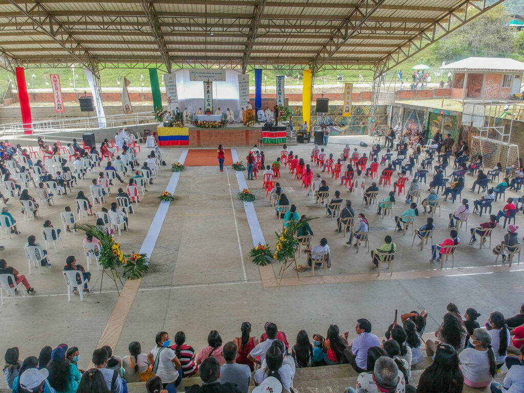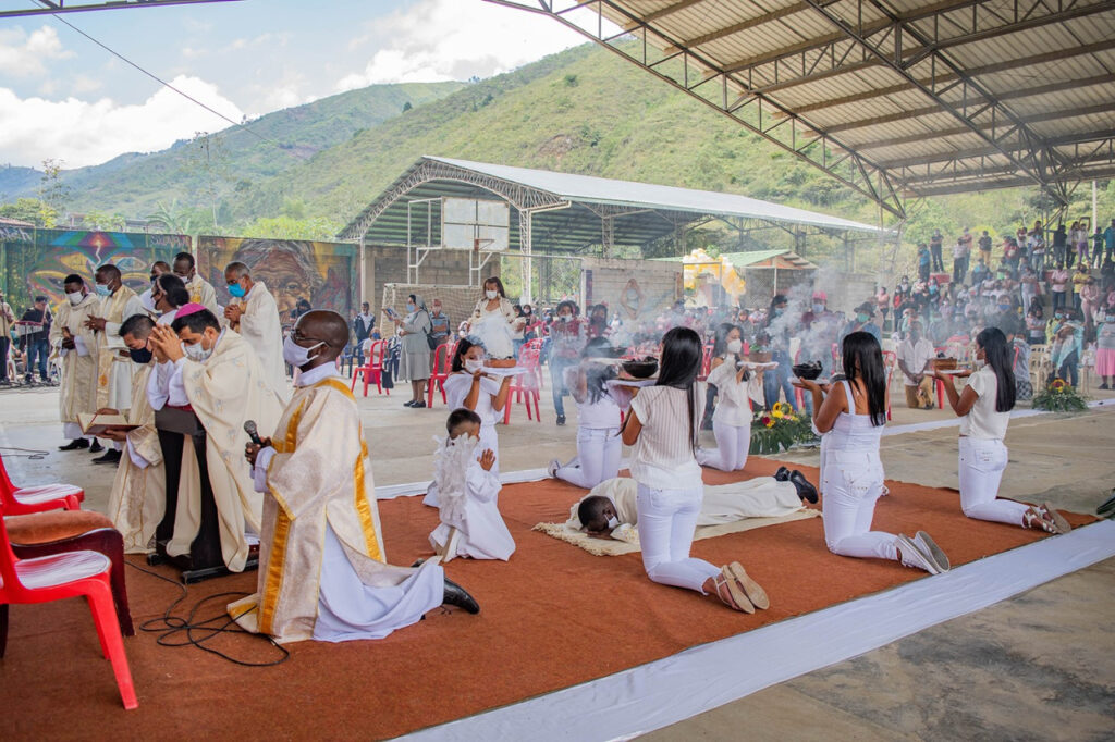 El acto comenzó con una solemne procesión acompañada con la Banda Marcial de la Institución Educativa Toribío, un grupo de mujeres indígenas, liderado con uno de los mayores de la comunidad, y acompañados de unas niñas y dos ángeles quienes en el momento de las letanías ofrecieron sahumerios con incienso, signo de la oración que sube a Dios, junto con los diáconos y los presbíteros con celebrantes.