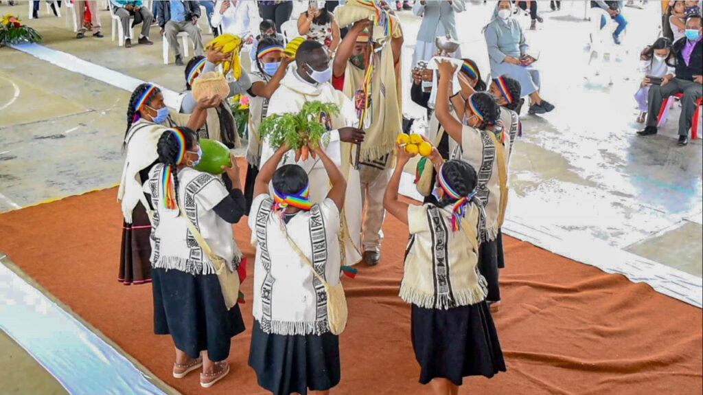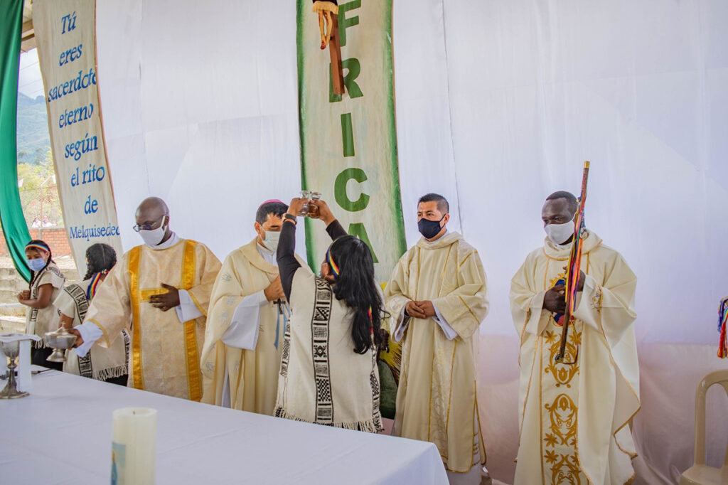 Llegando al sitio preparado, se da inicio a la Solemne Eucaristía de ordenación Presbiteral, en la cual resaltamos el momento de las ofrendas; la comunidad indígena liderado por uno de sus mayores a través de su danza tradicional propia de la cultura Nasa, con flautas y tambores, desde la mística ancestral reconocen la Autoridad Eclesiástica como su Padre Espiritual; el Neo Sacerdote recibe el bastón de mando como símbolo de Autoridad, además entregaron el sombrero, el capisayo, la jigra y las primeras cosechas de sus productos agrícolas.