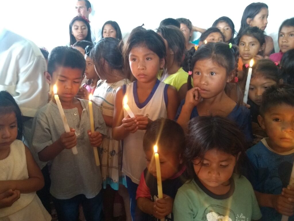 Niños de Cataparú sostienen velas en la celebración de la Pascua en su comunidad.