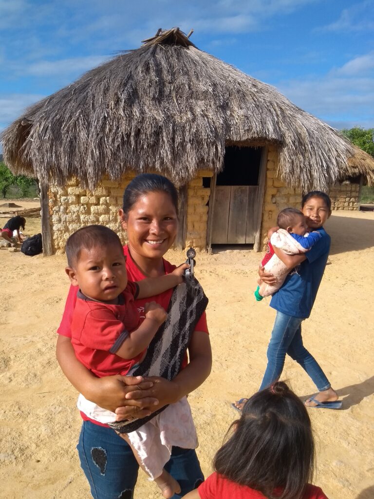 Una mujer indígena macuxí muestra orgullosa su hijo en Manaparú, mientras una niña con otro bebé la observa.