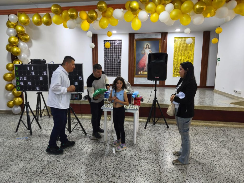Uno de los momentos centrales fue el bingo y bazar parroquial, en el que cada grupo aportó regalos, alimentos y diversos productos para la venta, con el fin de recaudar fondos destinados a las necesidades de la parroquia. Desde muy temprano, la comunidad inició la organización de la logística, dando paso a un día lleno de servicio, colaboración y fraternidad.