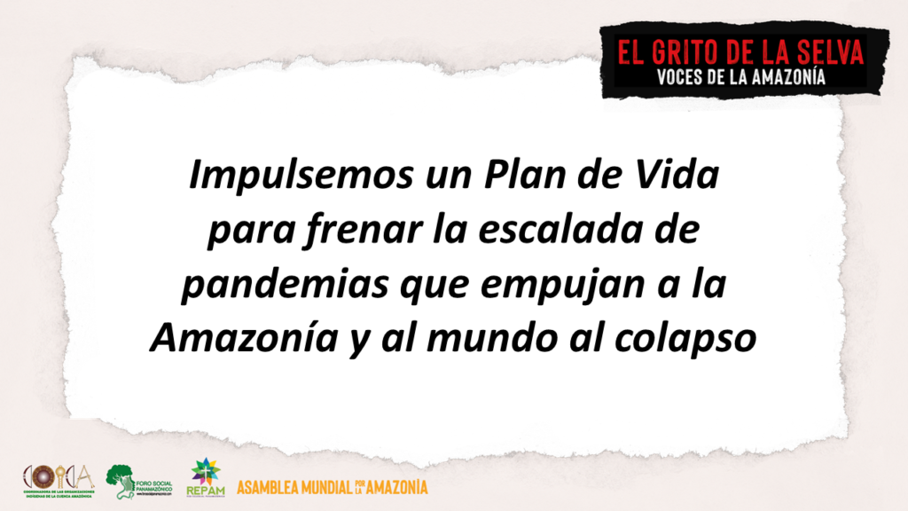 La Amazonía, vital para estabilizar el clima del planeta y para el futuro de la humanidad, hoy vive una escalada de pandemias, ante lo cual, os pueblos amazónicos, organizaciones sociales, de mujeres, medioambientales, culturales, religiosas, de defensa de los derechos humanos y de la naturaleza, lanzaron un Plan de Vida para salvar la Amazonía, al cierre del evento virtual “El Grito de la Selva, Voces de la Amazonia”, realizado el 26 y 27 de febrero de 2021.