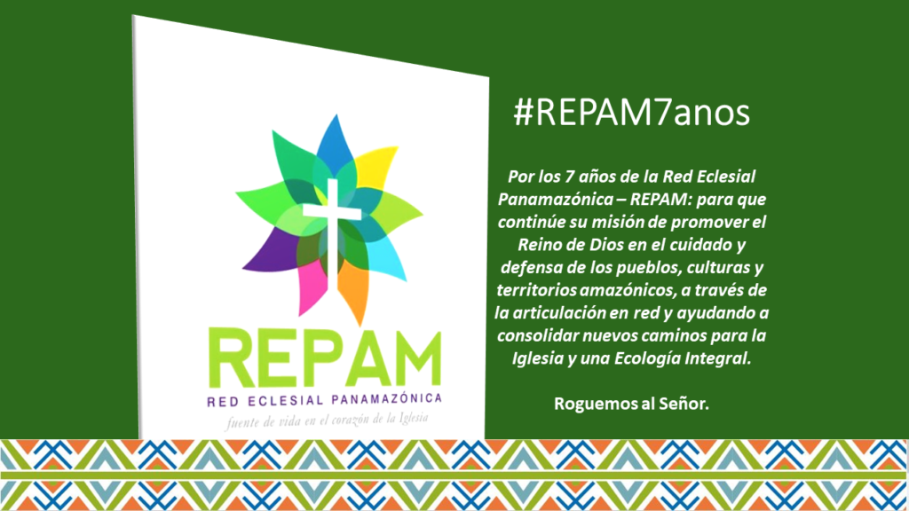 “Por los 7 años de la Red Eclesial Panamazónica – REPAM: para que continúe su misión de promover el Reino de Dios en el cuidado y defensa de los pueblos, culturas y territorios amazónicos, a través de la articulación en red y ayudando a consolidar nuevos caminos para la Iglesia y una Ecología Integral. Roguemos al Señor”.