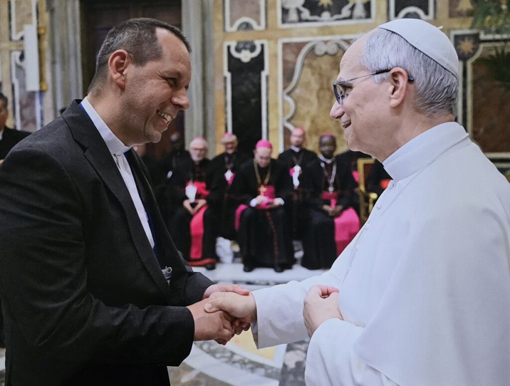 Padre Luca Bovio, IMC, primer director nacional de las OMP en Ucrania, es recibido por el Papa León XIV en Roma. Foto: Vatican Media